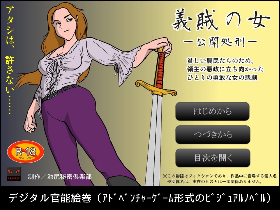 【作品形式】 アドベンチャーゲーム形式のビジュアルノベルです。 ストーリーの分岐はありません。音声もありません。 画面サイズは、960×640ピクセルです。 物語は、基本的に、登場人物のセリフだけで展開します。 状況設定などについての説明文はなく、 キャラクターや背景が変化することにより展開してゆきます。 小説よりは、漫画か、絵本に近い形式です。 (「デジタル官能絵巻」と称しています) 延々と文章を読まされるのが好きではない方でも お楽しみいただけると思います。 ※当初、漫画としての発表を考えていましたが、 実験的にこちらの形式を採用してみました。 ※使用画像数は、キャラ何枚、背景何枚とは 単純には計算しにくいのですが、 ファイル数で合計190枚程度を使用しています。 【あらすじ】 中世ヨーロッパ その地方の農民たちは、強欲な領主による重税によって 貧しい生活を強いられていた。 そこに突如として現れた「マルス」と名乗る盗賊団は、 領主の穀物倉を襲っては、食料を農民たちに分け与えていた。 義賊・マルスに手を焼く領主。 そこに、賞金稼ぎを生業とする男・ベッグが現れる。 「首尾よくマルスを捕らえましたら、 領主さまの参謀として召し抱えていただきたい」 「よかろう」 ベッグの罠に落ちるマルス。 こうして捕らえられたマルスの首領は、美しい女であった。 首領の首を即刻刎ねよ、と息巻いていた領主も、 その姿を見るや、考えを変えた。 「すぐに殺してしまうのも、惜しいのう。 なにか、よい手立てはないか?」 「領主さま、わたくしにお任せください」 領主の淫靡な目論見を叶えるべく、 ベッグは、マルスの首領を「公開処刑」とする。 だが、その真意とは? 【章立て】 第1章 強欲な領主と賞金稼ぎ/ 第2章 義賊たちの躓き/ 第3章 囚われた女首領/ 第4章 牢番の男たち/ 第5章 磔台へ/ 第6章 街の男たち/ 第7章 我慢の限界/ 第8章 裏切りの犬/ 第9章 四匹の虫たち/ 第10章 魂の殺人